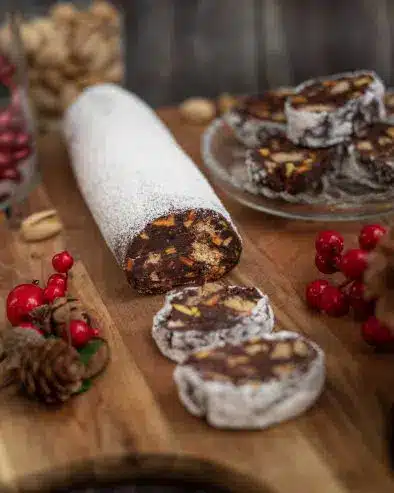 Para esta receita, Eva usou pistácio, cranberries, manga e bolacha. Para um aroma ainda mais festivo, pode-se deixar de molho os frutos secos em licor ou rum. Este salame fica pronto em pouco tempo, então é só deixar no frigorífico para endurecer durante a noite.