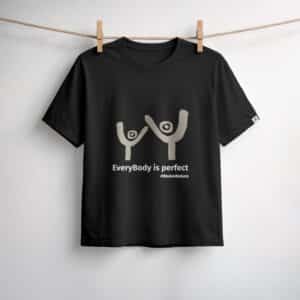 Uma T-shirt branca com um gráfico arrojado e minimalista de duas figuras verdes com a mensagem “EveryBody is perfect.” …