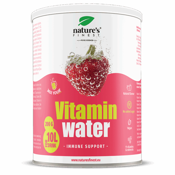 Água vitaminada Immune support é uma bebida refrescante com sabor a morango.