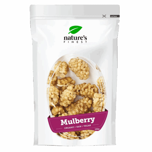 As amoras-brancas de produção biológica contêm fibras alimentares. Na forma seca, são um snack prático e muito saboroso para consumir em casa ou em viagem.