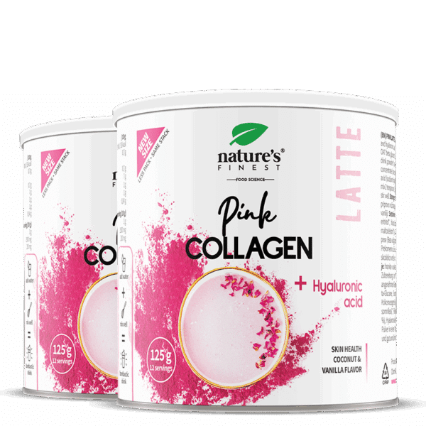 Pink Latte com colagénio, ácido hialurónico e ashwagandha, ajudam a repor o colagénio perdido, proporcionam pele saudável e mais flexível, contribuem para o equilíbrio emocional e resistência ao stress.