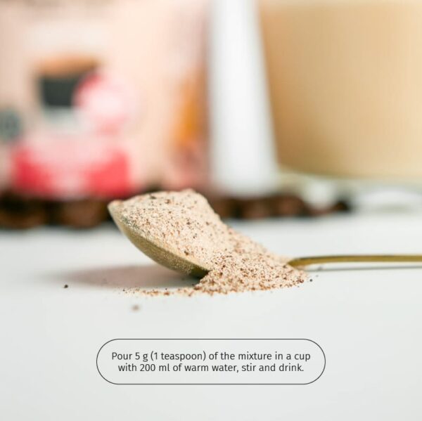 Verter 200 ml de água a morna mais de 5 g (1 colher de chá) de mistura numa chávena, mexer e beber.