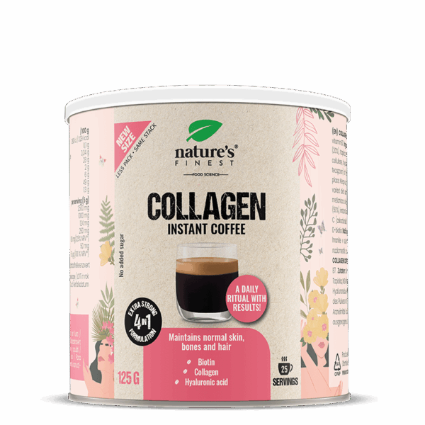 Colagénio, ácido hialurónico, bio-acção e vitamina C são ingredientes activos nesta deliciosa mistura de café que ajuda a aumentar a elasticidade da pele e a diminuir o aparecimento de rugas. A cafeína e o guaraná irão aumentar a energia e a atenção.