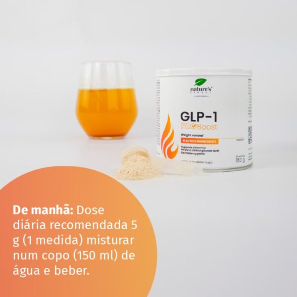 GLP-1 ProBoost: A dose diária recomendada é de 5 g (1 dosador). Misture com um copo (150 ml) de água e beba. Para uma medição precisa, aconselhamos o uso de balança.