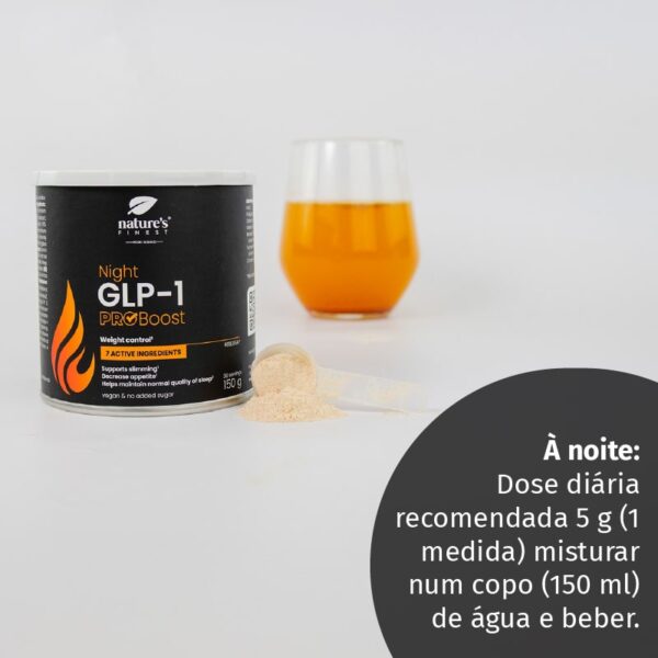 Night GLP-1 ProBoost: A dose diária recomendada é de 5 g (1 dosador). Misture com um copo (150 ml) de água e beba. Para uma medição precisa, aconselhamos o uso de balança.