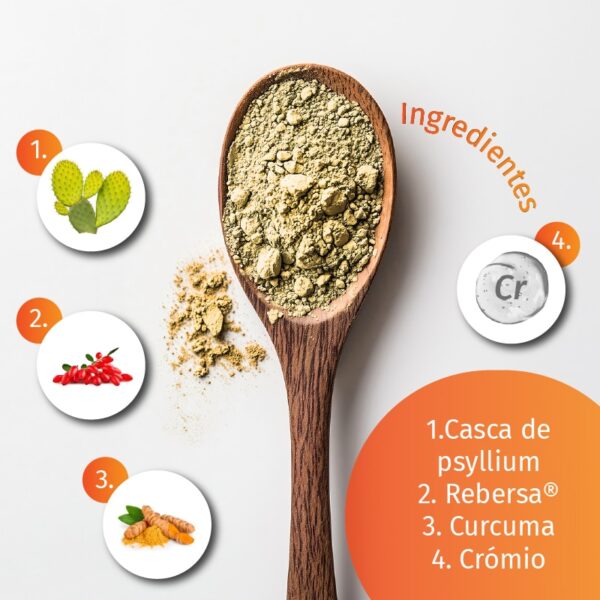 Figueira-da-índia (Opuntia ficus-indica), crómio, Rebersa® (extrato de berberina), curcuma e extrato de valeriana, canela em pó e inulina.