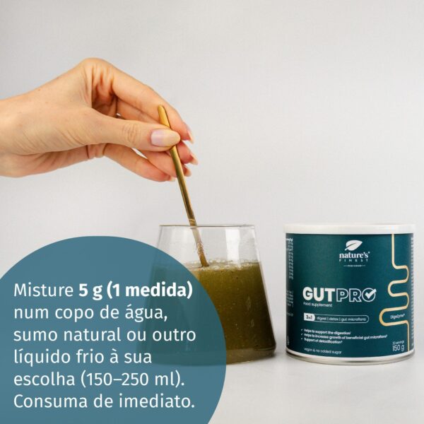 Misture 5 g (1 doseador) num copo de água, sumo natural ou outro líquido frio à sua escolha (150–250 ml). Consuma de imediato após a preparação, pois a mistura vai engrossando com o tempo. Se preferir, também pode adicionar o pó a um batido ou a um iogurte.