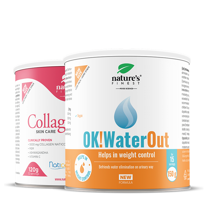 Durante os primeiros 15 dias, misturar 2 colheres (10 g) de bebida OK!WaterOut com sabor a ananás num copo de água de manhã. Depois, durante os 12 dias seguintes, misturar 2 colheres (10 g) de SkinCare Collagen num copo de água à tarde ou à noite, deixar 2 minutos para que o colagénio se dissolva completamente e beber. A bebida tem um agradável sabor a morango. Com 10 g de pó consome 5 g de peptídeos de colagénio Naticol.