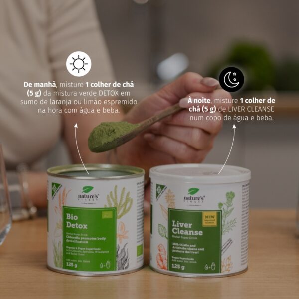De manhã, misture 1 colher de chá (5 g) da mistura BIO DETOX em sumo de laranja ou limão espremido na hora, diluído em água, e beba. Isso despertará o corpo e estimulará a desintoxicação.