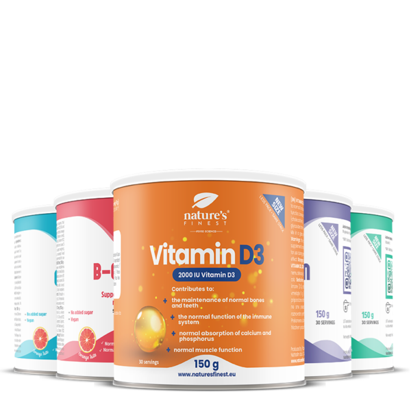 Adicione 5 g de cada produto (Vitamina C, Magnésio, Cálcio, Complexo B e Vitamina D3) em um copo de água, misture bem e beba.